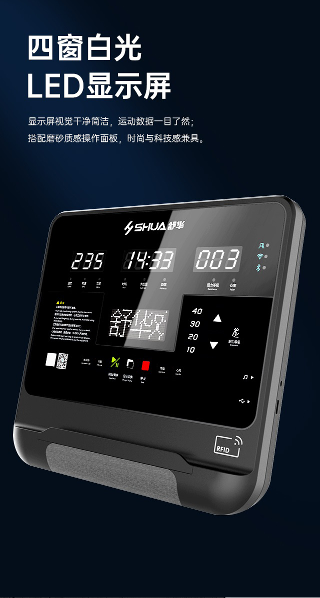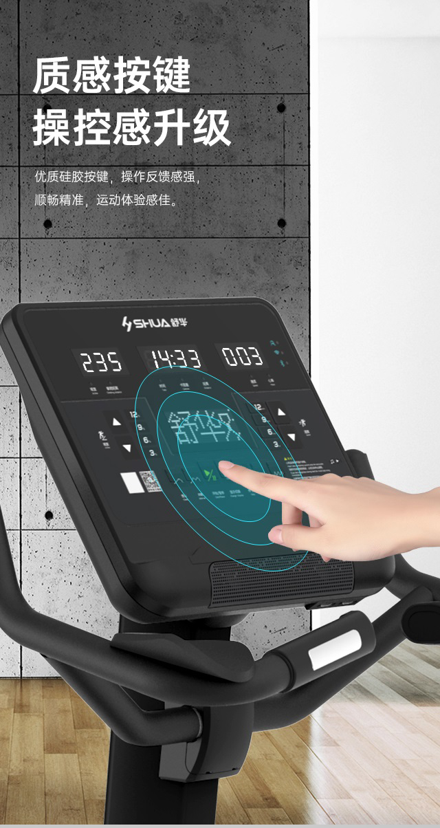 舒华立式商用健身车SH-B9100U(V10)触屏版拥有超大显示和操作屏幕, 可以任意设置阻力、时间和距离等参数,还可以即时显示心跳和转速等数据,同时,SH-B9100U提供多项科学运动处方,更轻松掌握运动节奏。