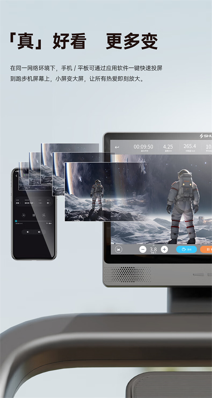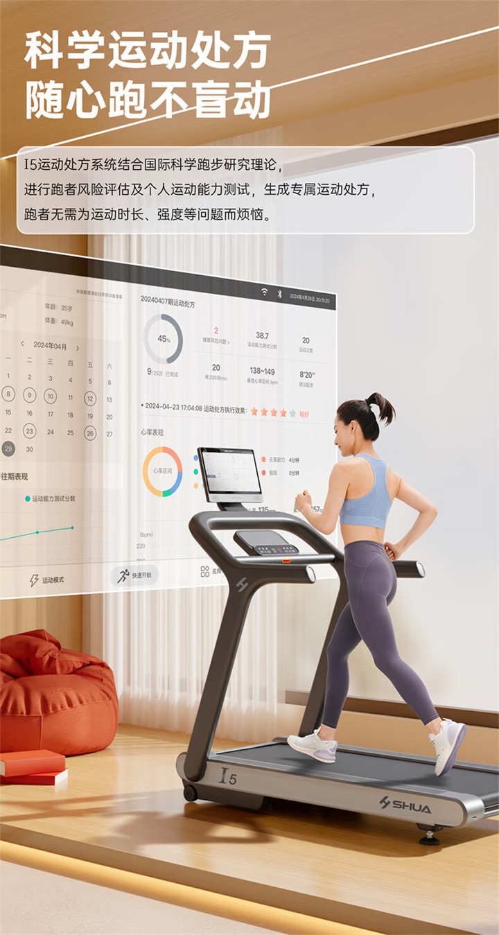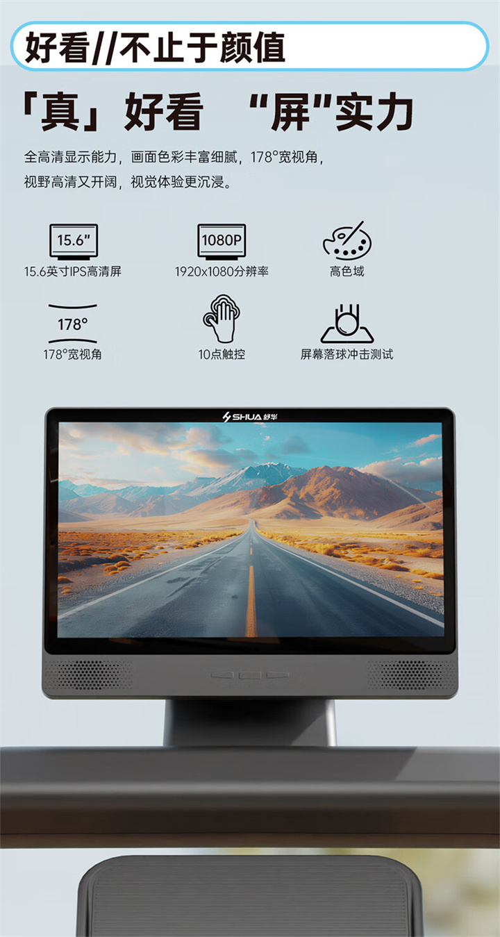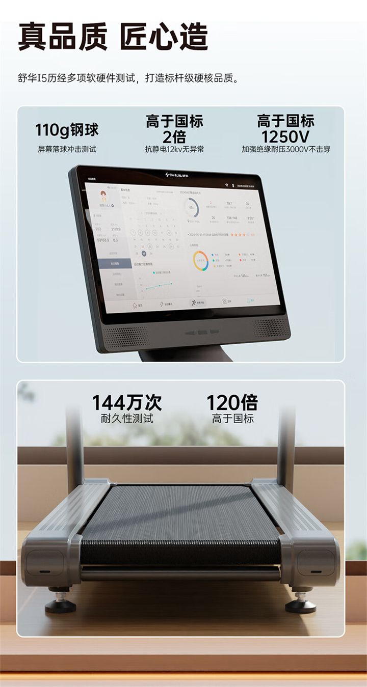 舒华X5 Pro豪华智能跑步机采用全新舒华跑步机系统,搭载21.5寸大屏,内置九种运动程序,包括场景跑、在线约跑和一键体育考试等内容,亦有教练在线科学指导和比赛互动,可在线升级,历经耐久性测试,让您使用更安全,双跑台设计,全减震系统,核心动力采用F级耐高温马达,5.0HP峰值马力,提供源源动力,让您享受每一次畅跑体验。